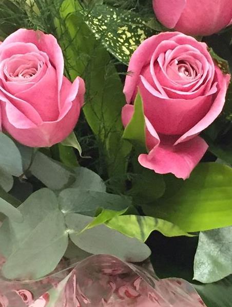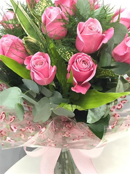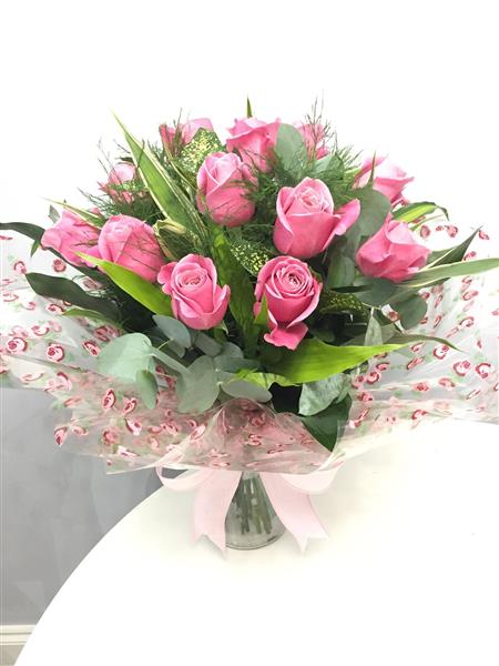 A handtied of 12 pink roses, ready in water in a vase ,easy to just place down somewhere with no work for the recipient !