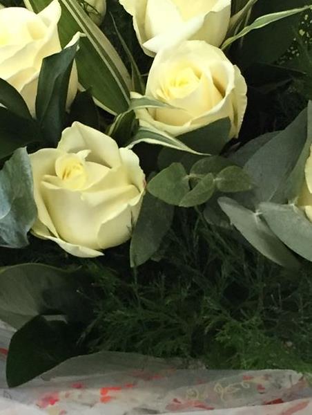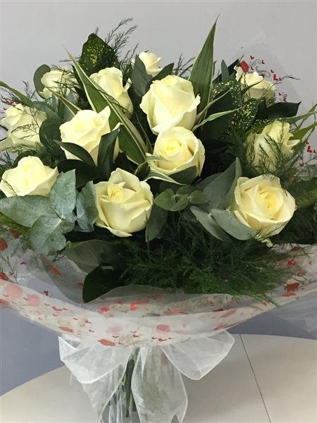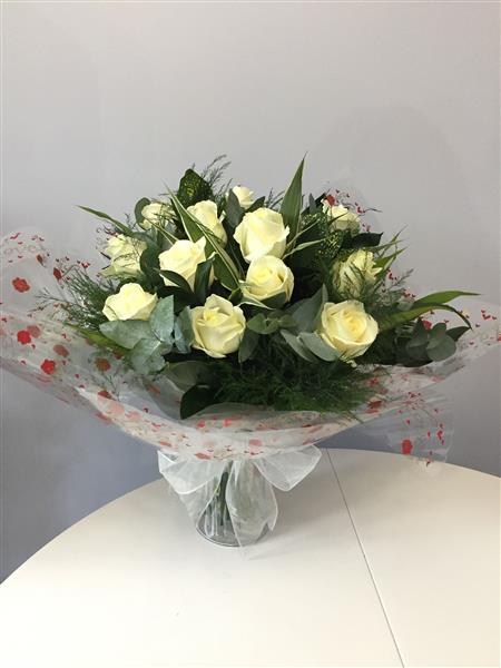 12 white roses handtied, in water and in a vase, all ready to go,no need to hunt those vases out!