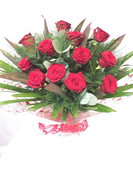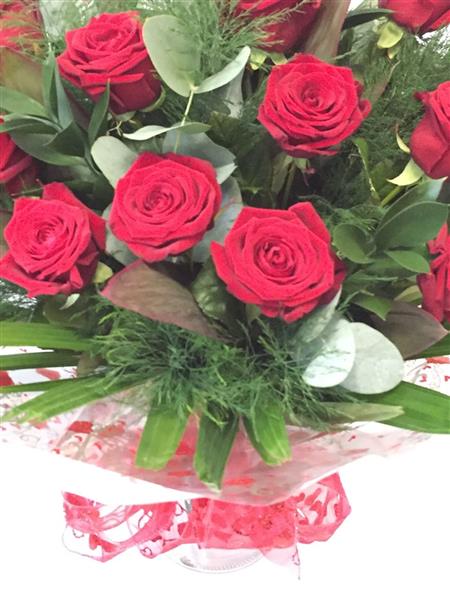 12 red rose handtied in water in a vase , no need to hunt one down ! Easy to place somewhere ready to go . Option to choose 24 red roses also