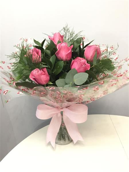 6 Gorgeous pink Roses handtied and delivered in water in a vase, easy for the recipient to just place somewhere without the hassle of finding a vase !