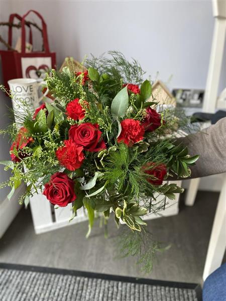 6 Long Stemmed Red Roses and 6 Red Standard Carnations hand tied with seasonal foliage. All aqua packed in a gift bag so recipient doesn't have to do anything for the first 48 hours. Care Card and food included