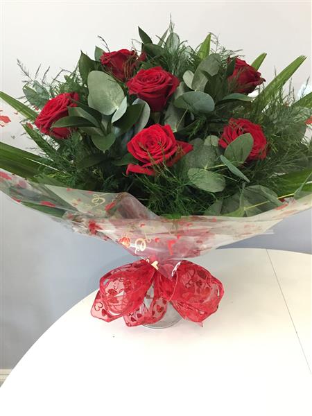 A Handtied Bouquet of 6 Red Roses and foliage delivered in water in a vase.Perfect for an instant gift!