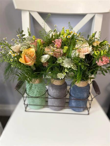 Arranged carefully in this eco friendly bottle set, flowers may differ from those shown on picture but will still be in the pastel colour scheme.