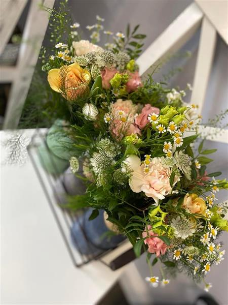 A fabulous selection of the prettiest pastel blooms of the day, mixed with a little foliage.