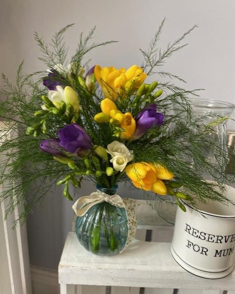 Approx 25cm tall with 9 mixed freesia and fern, a perfect little gift for Mum this Mothers day