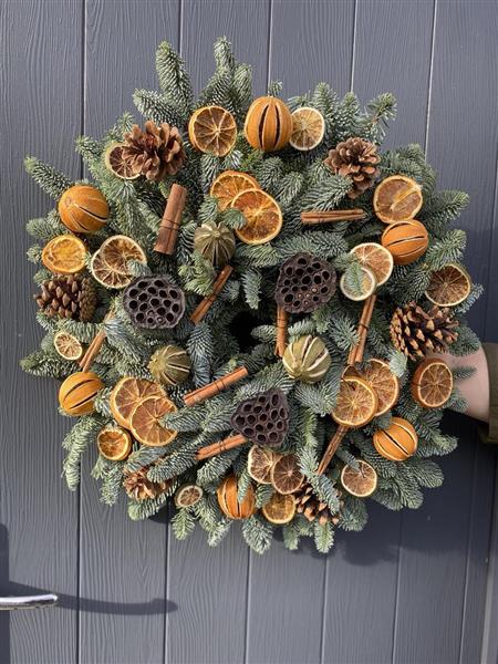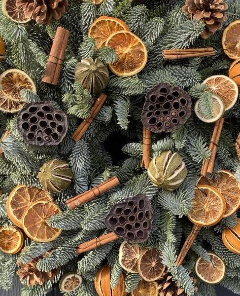 Scrumptious dried orange slices,whole oranges,chillies birch stars or pine cones (stock allowing)A fruity little number!