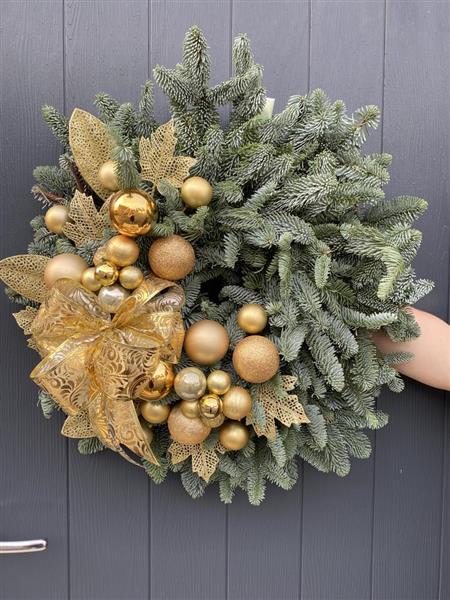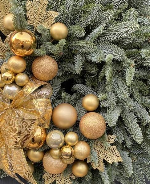 How about something a little different, new this year our blue spruce pine door garland with a gold spray and bow detailing.
