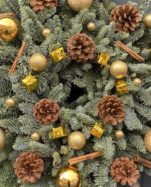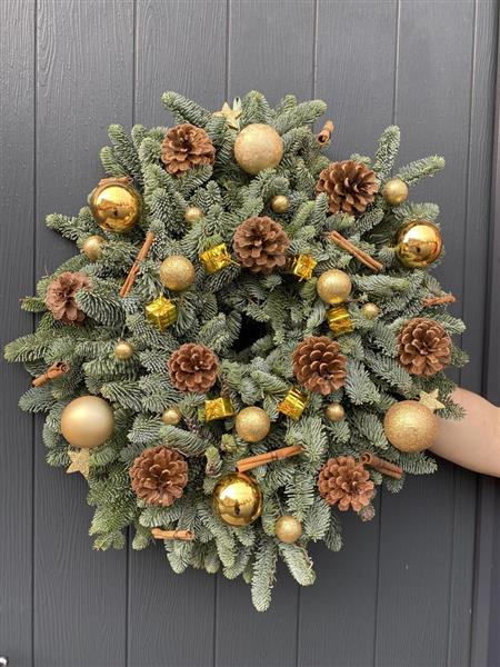 Gold themed door garland, please note all our wreaths are bespoke made and may differ slightly in content although stay in keeping with the theme.