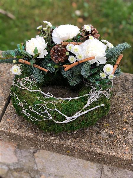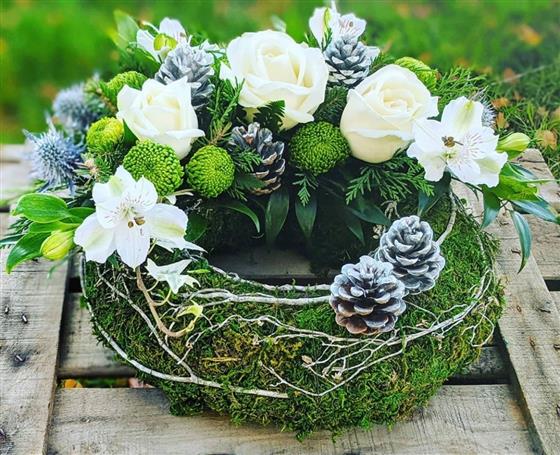A long lasting Moss base wreath with a section for oasis to take a fresh flower arrangement, choose our standard with carnations & spray Chrysanthemum or our luxury with roses, alstromeria and spray chrysanthemum. Approx 10" in size.
