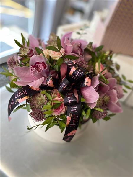 Beautiful long lasting cymbidium orchids arranged in a hat box, a stylish gift to impress anyone.