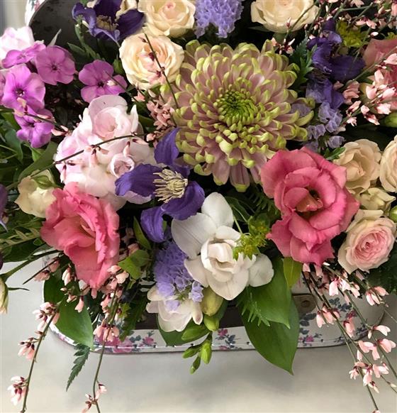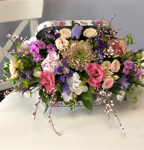 Pretty arrangement nestling inside a suitcase, flowers are arranged in oasis in a dish , easily removed for watering by the recipient.