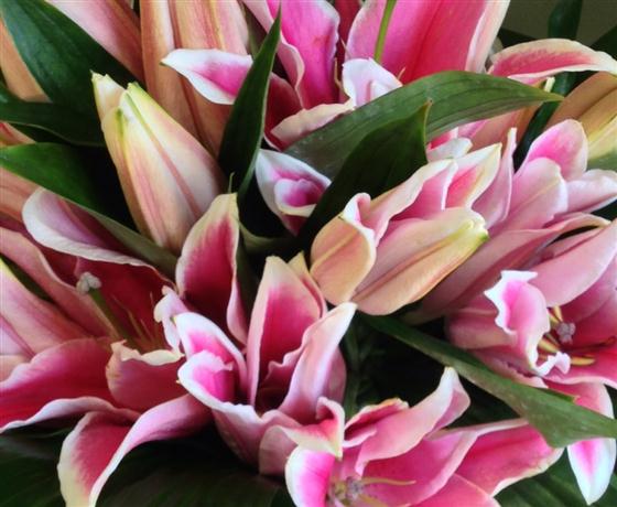 Pink Lillies with mixed foliage to make a stunning display of highly perfumed blooms.