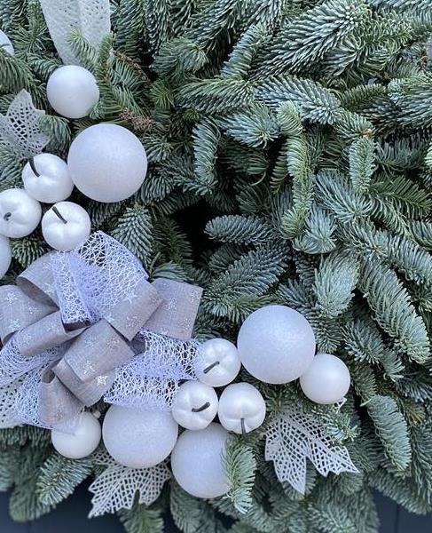 How about something a little different, new this year our blue spruce pine door garland with a white spray and bow detailing.