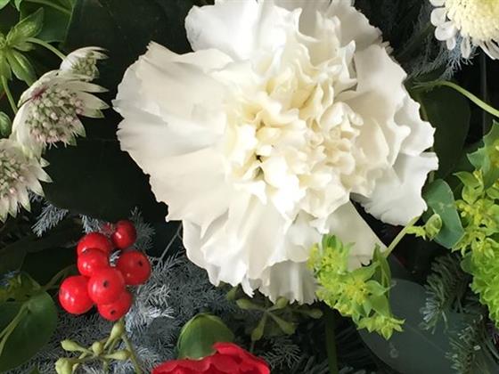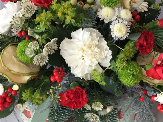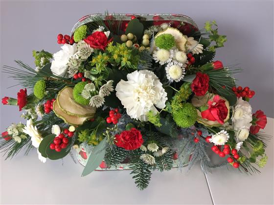A lovely Winter themed arrangement designed in a winter themed suitcase.We will choose the flowers to match the colours of the festive suitcases we have in stock, which are whites, greys, reds and greens.