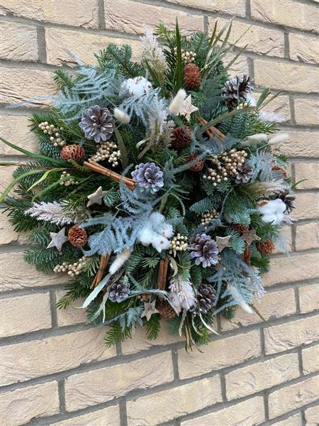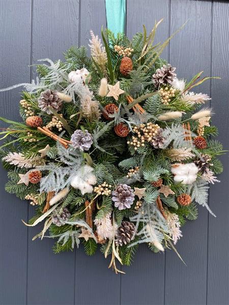 Inspired by frosty mornings, using natural pine cones and cotton as a feature, please note all our wreaths are bespoke made and may differ slightly in content although stay in keeping with the theme.